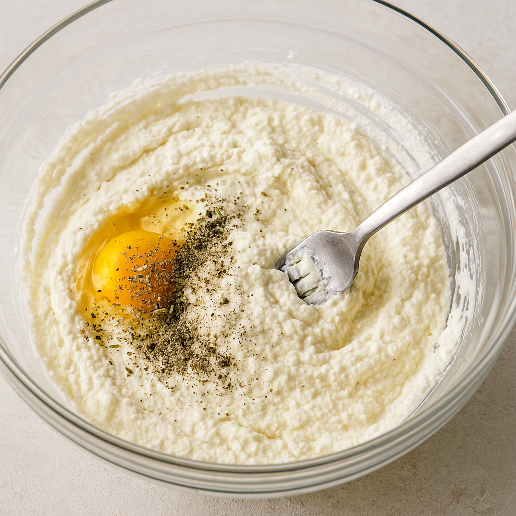 In a bowl, combine the ricotta cheese, egg, Italian seasoning, garlic powder, salt, and black pepper. Mix until well blended.