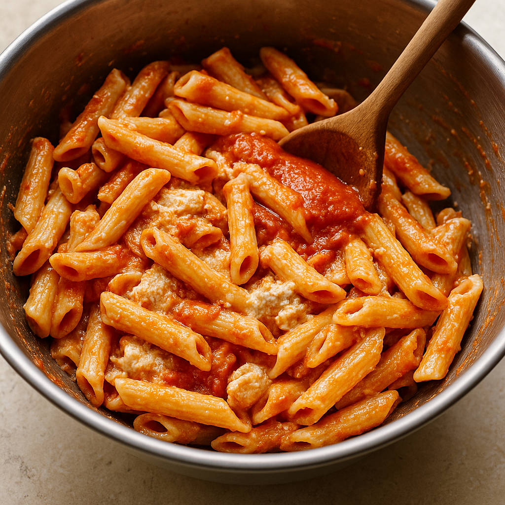 In a large mixing bowl, combine the cooked ziti, ricotta mixture, and 1 cup of marinara sauce. Stir until the pasta is well coated.