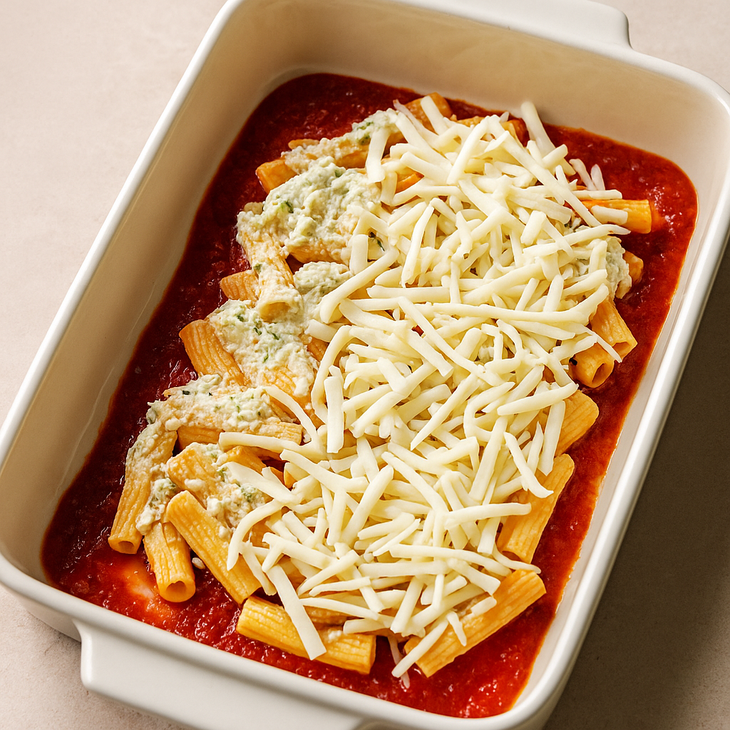 In a greased baking dish, spread a thin layer of marinara sauce on the bottom, then add half of the ziti mixture. Sprinkle with half of the shredded mozzarella.