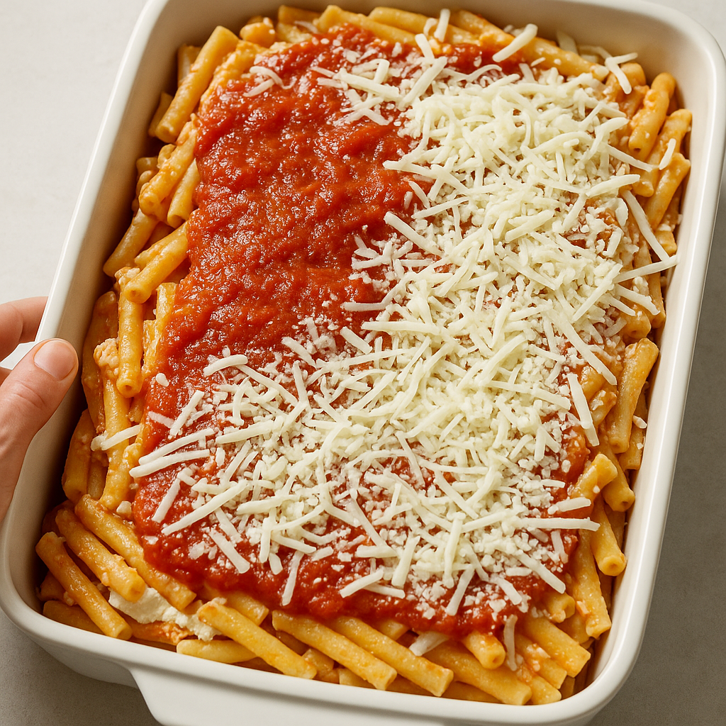 Spread the remaining ziti mixture over the first layer, then top with the remaining marinara sauce and sprinkle with the remaining mozzarella and Parmesan cheese.