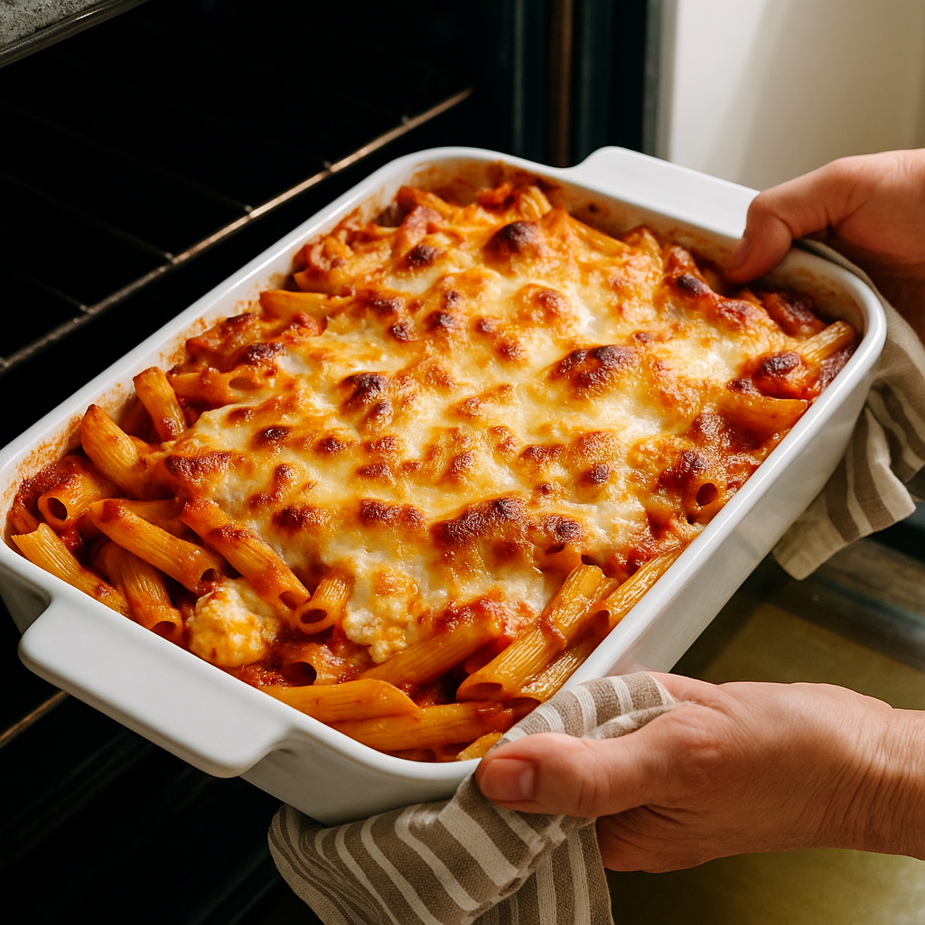 Allow the baked ziti to cool for 5-10 minutes before serving. This helps the layers set for easier slicing.