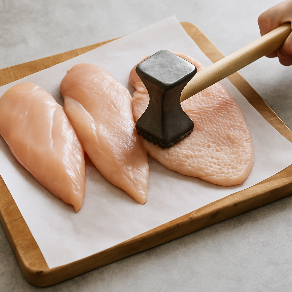 Using a meat mallet, pound the chicken breasts to an even thickness for quick and even cooking.