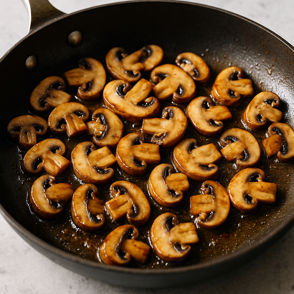 In the same skillet, add the sliced mushrooms and cook until they are browned and tender, about 5 minutes.