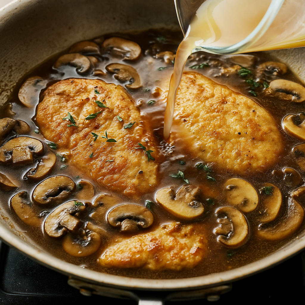 Pour in the Marsala wine and chicken broth, scraping up any brown bits from the bottom of the pan. Add thyme and stir well.