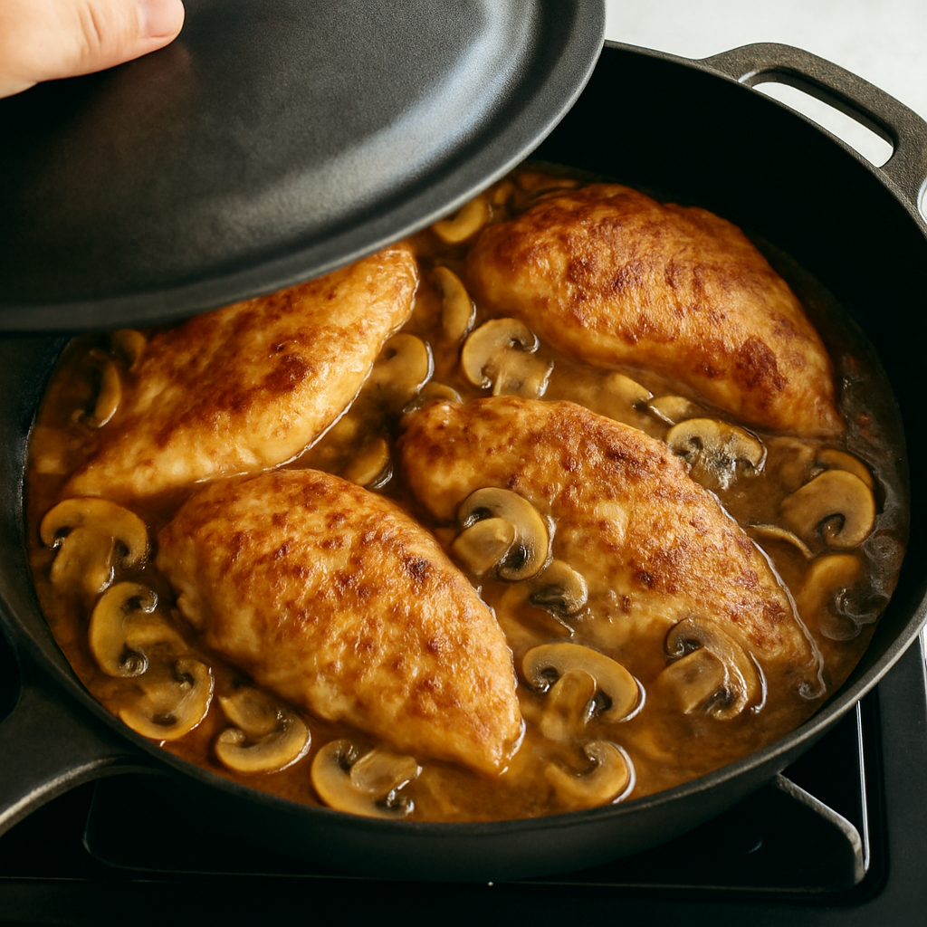 Return the chicken to the skillet, cover, and simmer for about 10 minutes until the chicken is cooked through and the sauce thickens slightly.