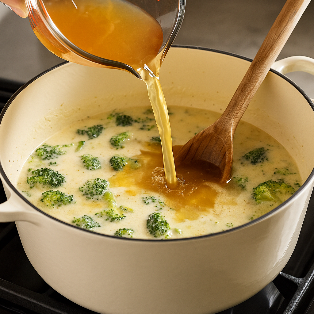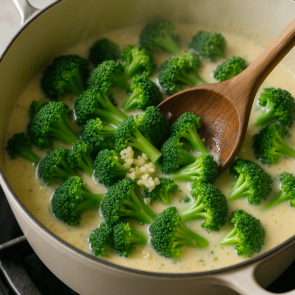Add vegetable broth and bring the mixture to a boil. Reduce heat and let simmer for 10 minutes until the broccoli is tender.