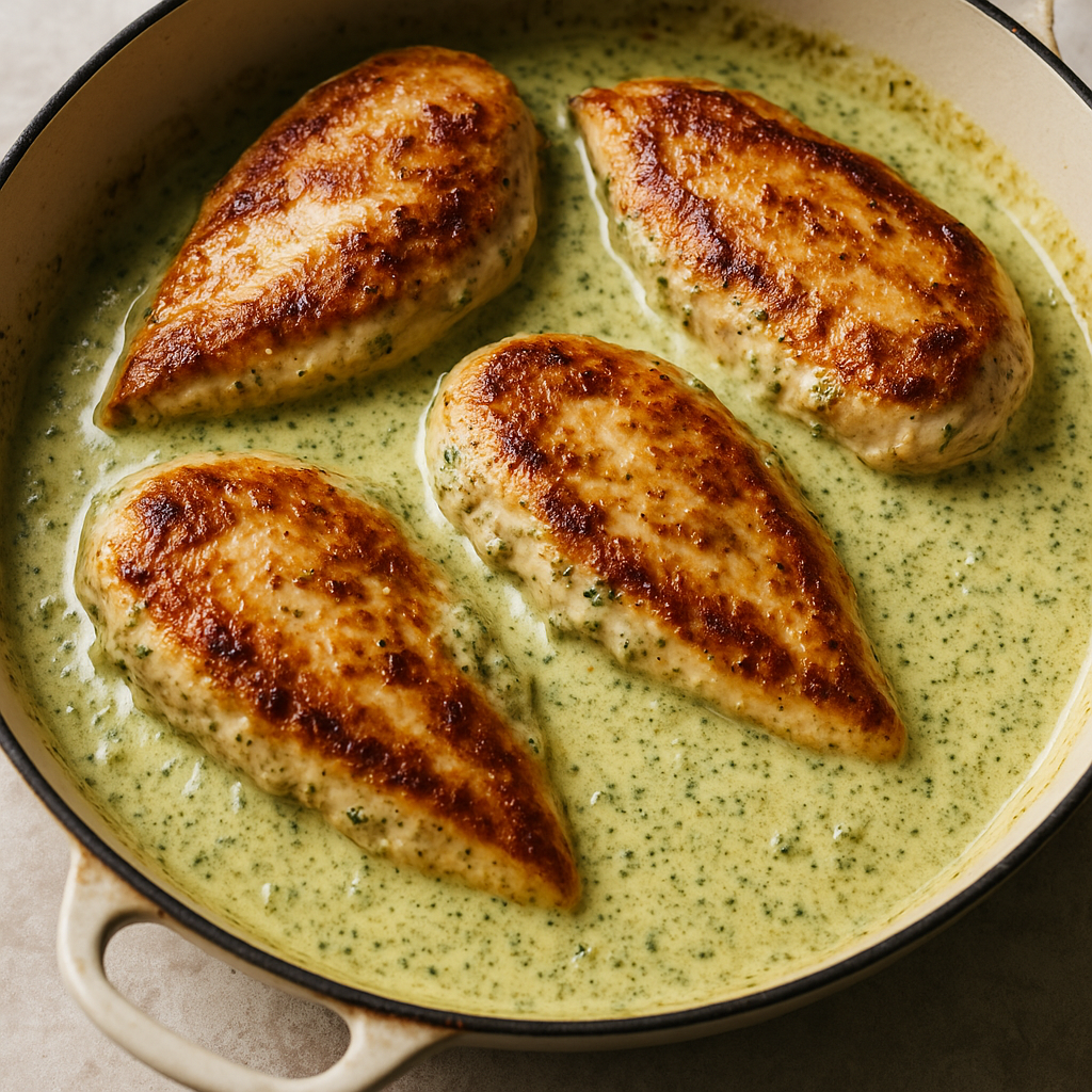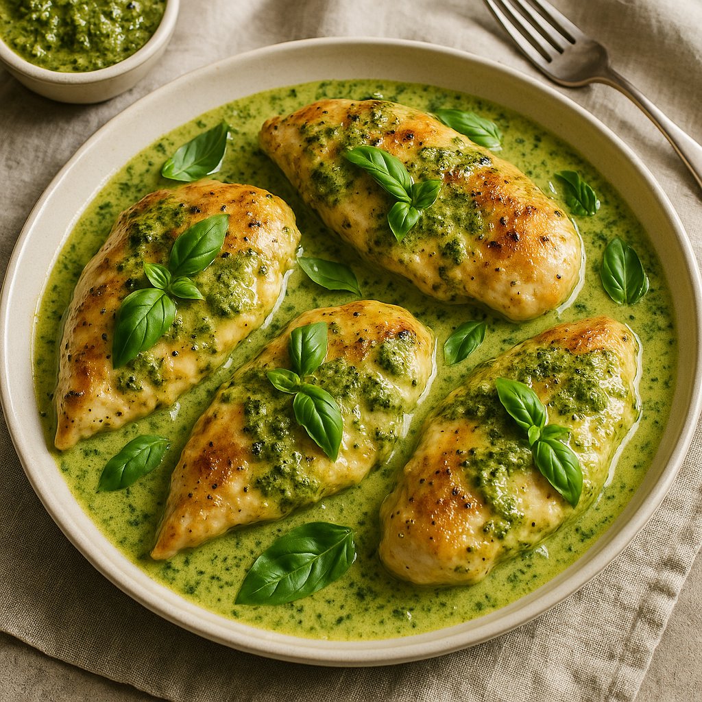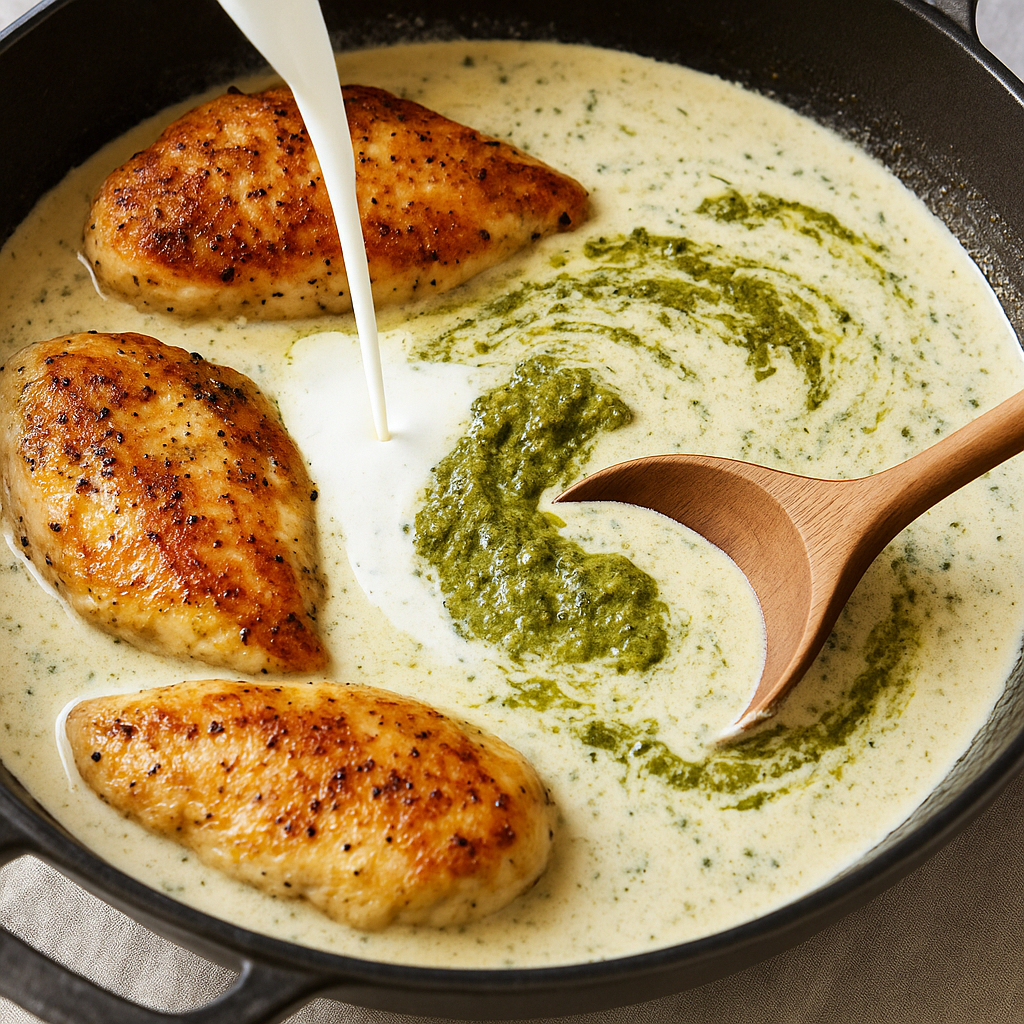 Return the chicken to the skillet, ensuring it is well-coated with the pesto cream sauce. Simmer for another 2 minutes.