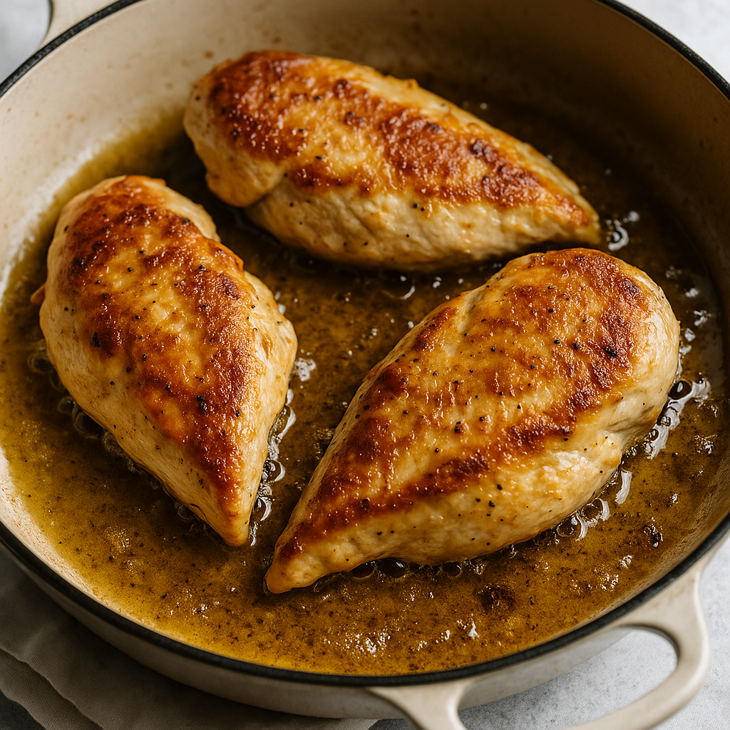 In a large skillet, heat olive oil over medium-high heat. Add the chicken breasts and sear for 6-7 minutes on each side until golden brown and cooked through.