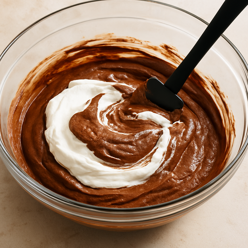 Gently fold the whipped cream into the chocolate mixture in batches until fully combined with a light hand.