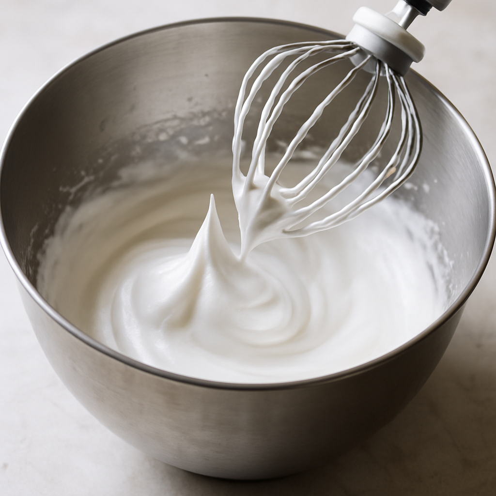 In a separate clean bowl, beat the egg whites until soft peaks form, then gradually add the remaining sugar until stiff peaks develop.