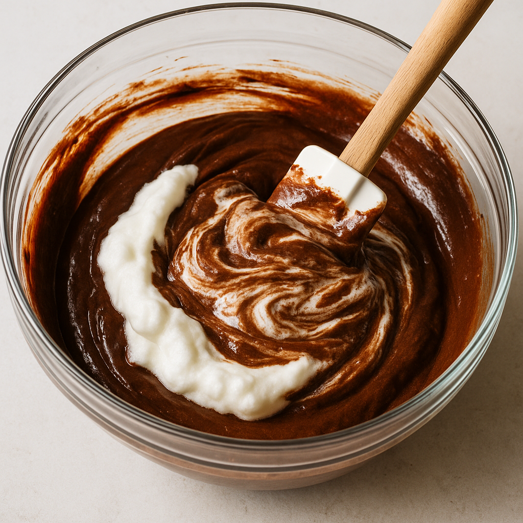 Carefully fold the whipped egg whites into the chocolate mixture until no white streaks remain, ensuring to maintain the volume.