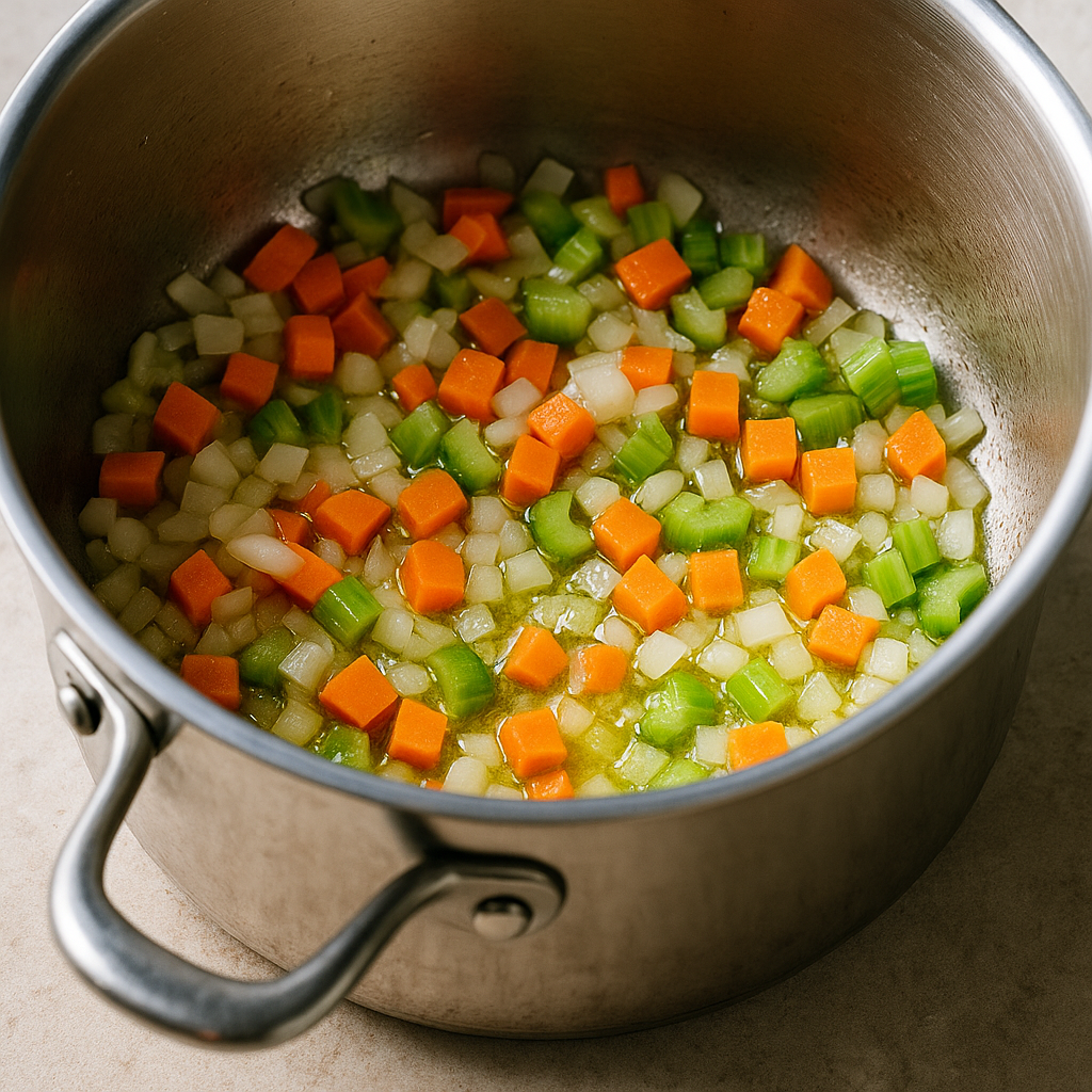Add the diced onion, carrots, and celery, and sauté until softened, about 5 minutes.