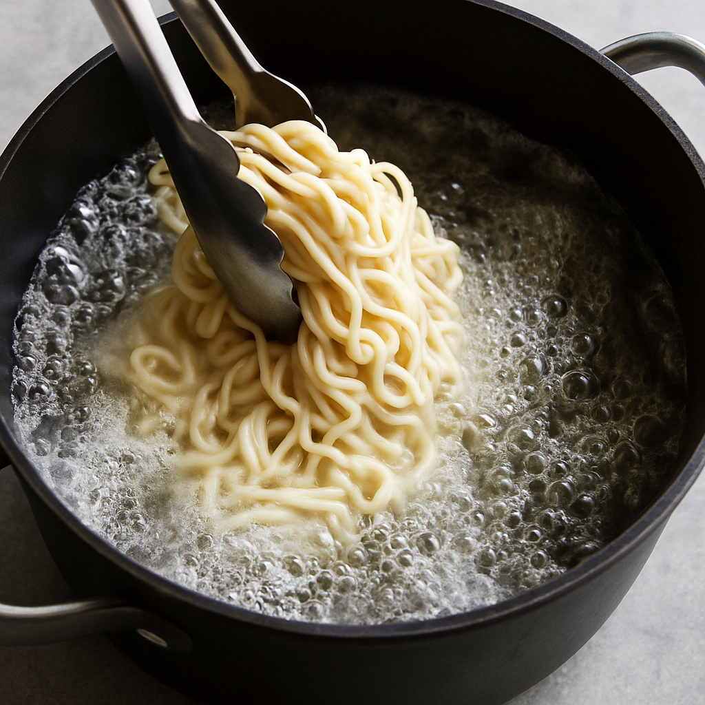 In a separate pot, bring water to a boil and add the fresh ramen noodles.