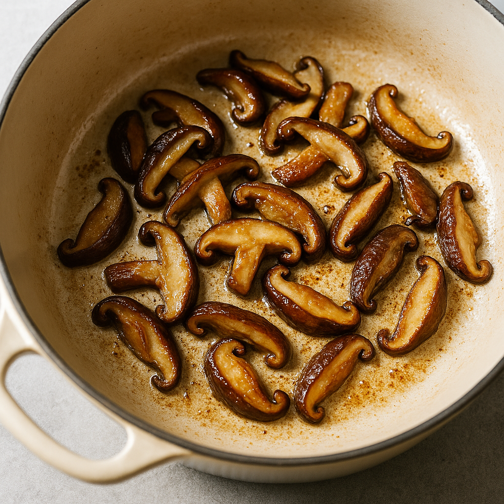 In the same pot used for the ramen noodles, add a bit of oil and sauté the sliced shiitake mushrooms.