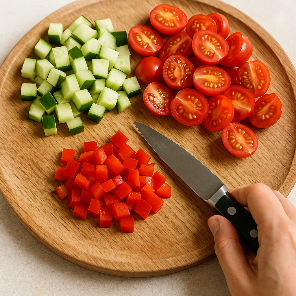 While the quinoa cooks, prepare the vegetables: dice the cucumber, halve the cherry tomatoes, and dice the red bell pepper.