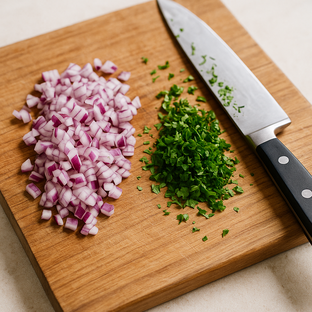 Finely chop the red onion and parsley and set them aside.