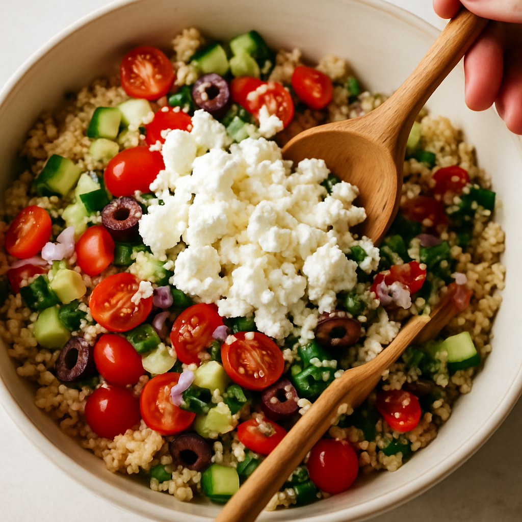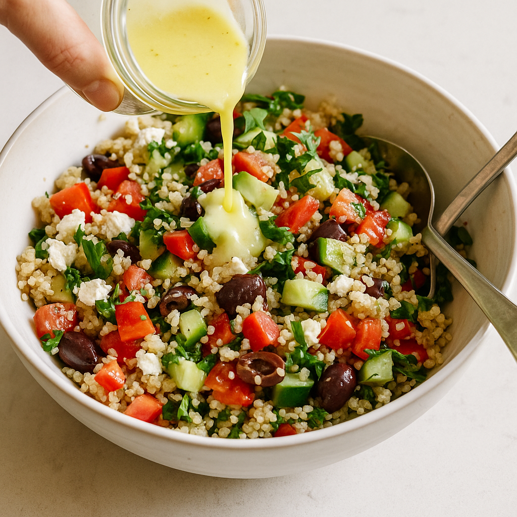 This dish showcases the beauty of simple ingredients and their ability to come together in harmony. The quinoa acts as a perfect base, not only providing protein but also a subtle earthiness that complements the fresh produce. The cooking technique of rinsing the quinoa before boiling removes any bitterness, ensuring a pure flavor that is enhanced by the crunchy, colorful toppings. Each ingredient plays its part, making the Mediterranean Quinoa Bowl a comforting and nutritious choice.