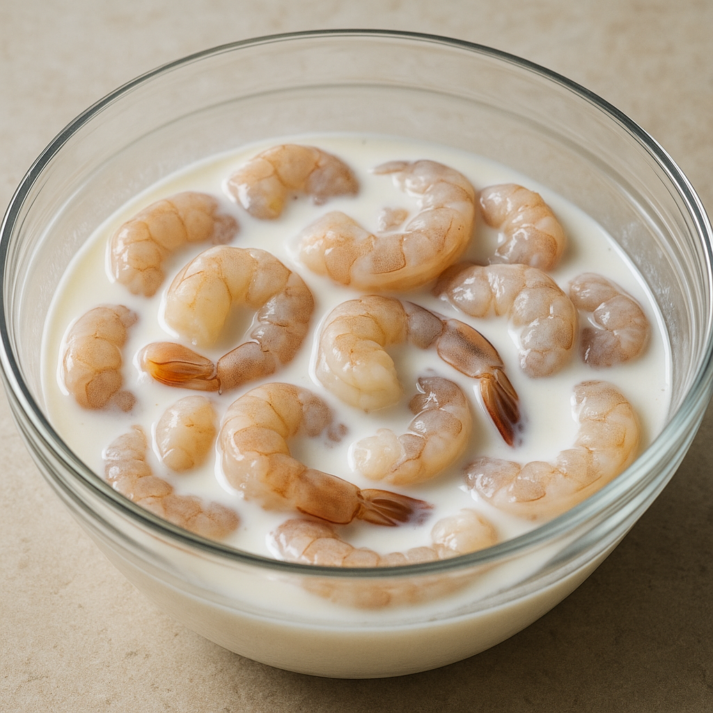 In a large bowl, soak the shrimp in buttermilk for at least 15 minutes to tenderize and flavor them.