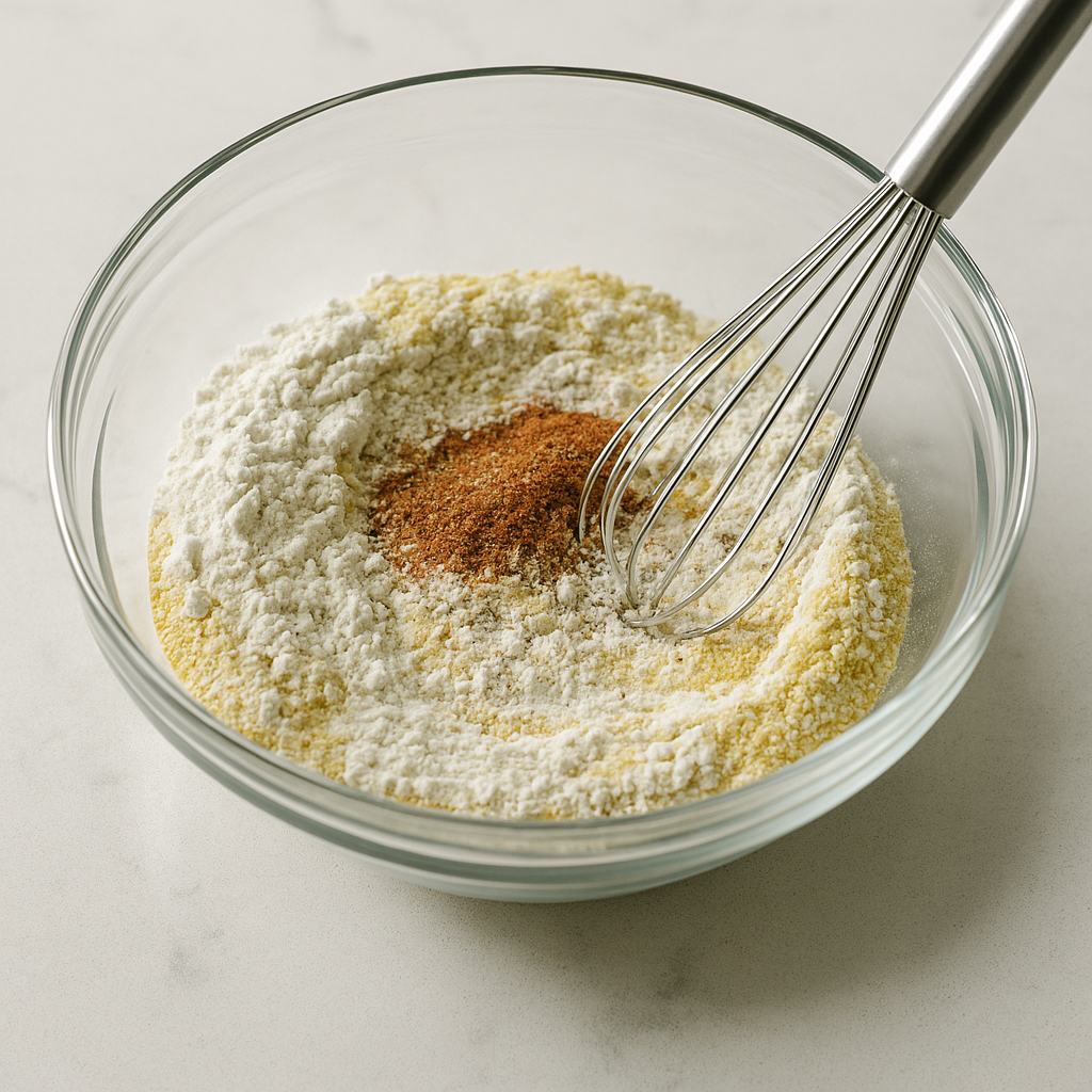 In a separate bowl, combine flour, cornmeal, Cajun seasoning, salt, and black pepper, mixing well.