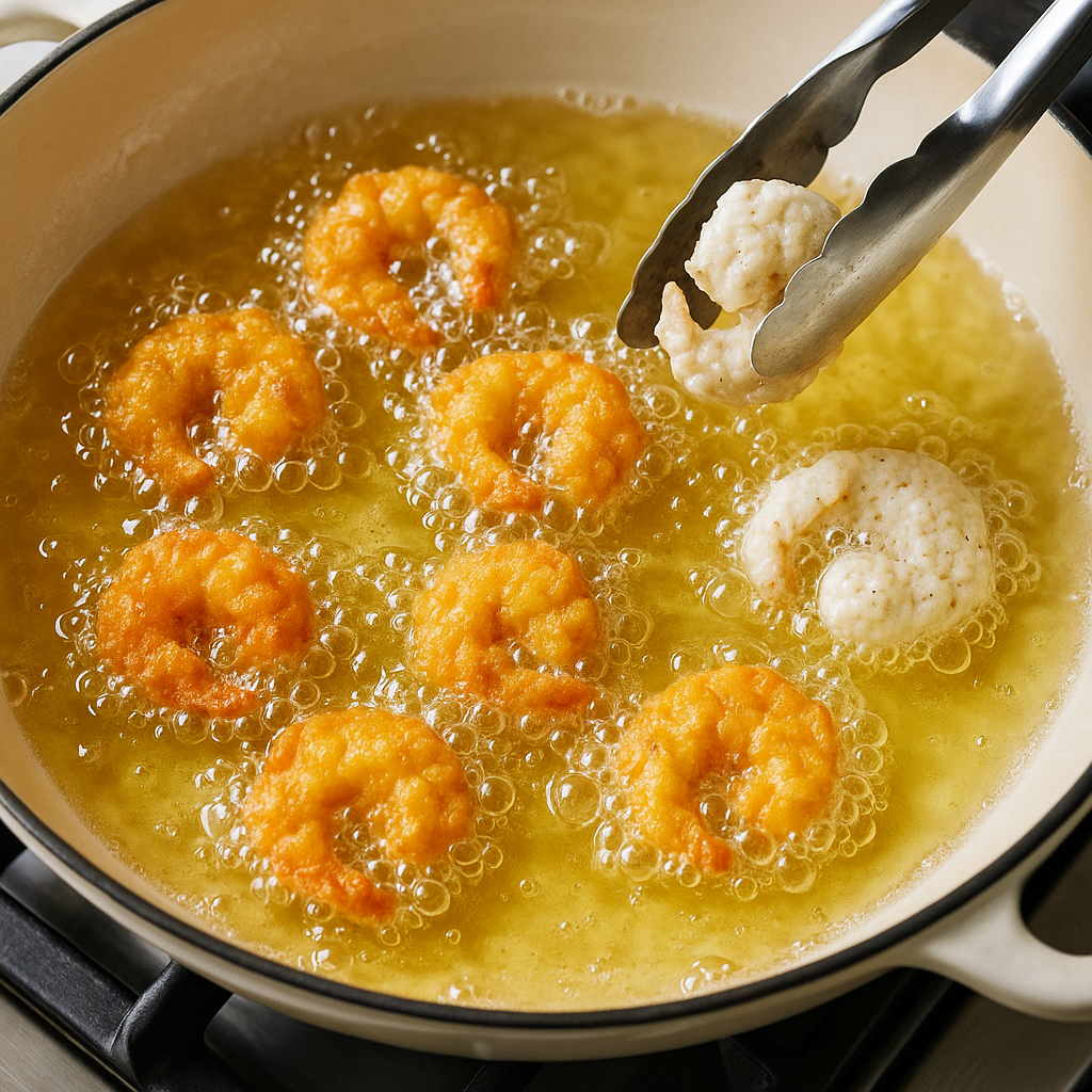 Carefully add the coated shrimp to the hot oil in batches, frying until golden brown and crispy, about 2-3 minutes per side.