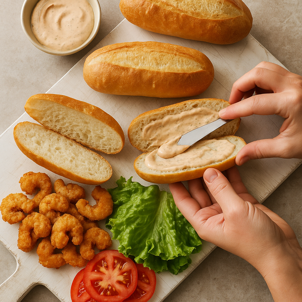 Fill each roll with fried shrimp, followed by shredded lettuce and sliced tomatoes. Drizzle with additional remoulade and hot sauce if desired.